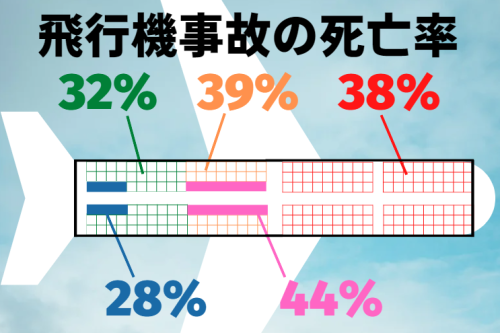 航空機事故「後部座席 = 生存率が高い」は本当か? …のデータによると、飛行機で死亡する確率は 「0.0005%」 であるのに対し、自動車は「0.9%」である。さらに、落雷による死亡確率は「0.0012%… (出典:Merkmal) |
